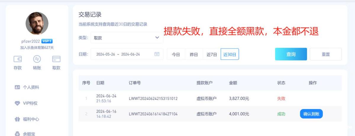 627天的乐鱼账号pfizer2022,这两天重新登陆准备打欧洲杯,充了3500打百家乐,赢了300块钱居然直接失败全额调整,说批量刷水套利,请问都什么年代了你还刷水,刷的哪门子水?你不用抽水的?套利套的又是哪门子的利?利就是30块钱的反水?周红包,回归礼包都没领你给风控?乐鱼是所有平台最黑的,请各位擦亮双眼,远离黑平台。正常玩家在乐鱼你只要玩的好,流水上去了然后没什么输赢,他都能把你的反水,红利全部调整掉,没错这个台子就是这么的玩不起,毫无下限可言,他甚至把黑本金也黑的如此的理所当然,你只要这个手机号码绑定了其他平台,他就认为你有关联多平台玩家,黑你没商量,黑你多少是多少,黑到就是赚到,毫无底线的台子,令人作呕